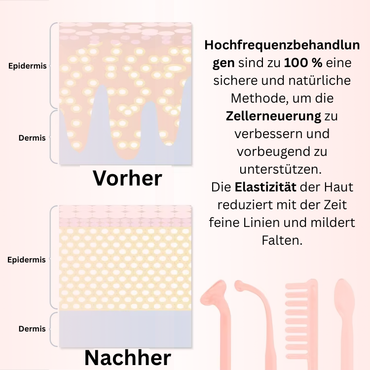 Hochfrequenztechnologie: Unser Luxeface nutzt sanfte Hochfrequenzwellen, die tief in die Haut eindringen und die Durchblutung fördern. Dies hilft, die Zellregeneration anzuregen und die Hautstruktur sichtbar zu verbessern.